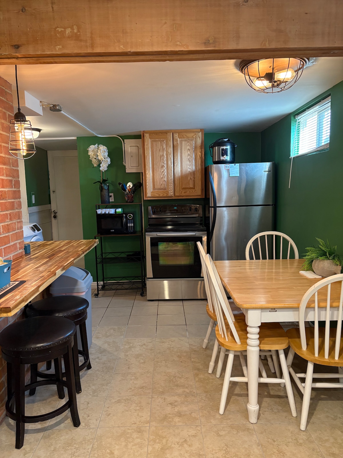 Náš priestranný, novo dokončený suterénny byt je skvelou voľbou pre rodiny, priateľov alebo kohokoľvek, kto hľadá domov ďaleko od domova. Vstúpte svojím vlastným bezkľúčovým vchodom. Náš byt má otvorený koncept stravovania, kuchyne a obytného priestoru. Kuchyňa je plne vybavená úplne novými spotrebičmi. Skrinky sú zásobené potrebami na varenie/stolovanie. Obývací priestor poskytuje dostatok priestoru na stretnutie na hranie, konverzáciu alebo sledovanie televízie na 65-palcovom monitore SmartTV.