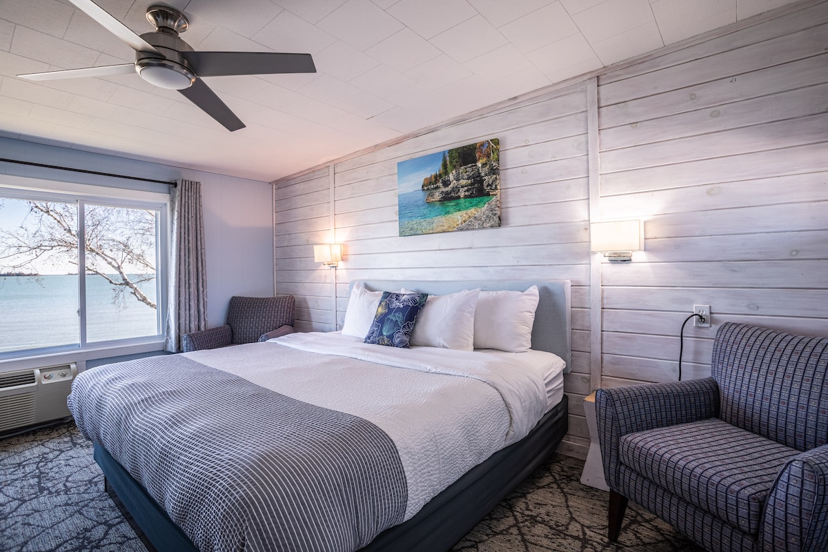Y'all travel like royalty and stay at The Queen in downtown Sturgeon Bay! Vibrant colors, fun art, full kitchen, lovely shower and comfy space make this Suite a fun and comfortable retreat for when you're not out riding the county. King size bed, Smart TV, fast Wi-Fi and classy furniture give it amazing comfort as well as a private patio. The Suite tips it's hat to Dolly and the hotel shows love for women and royalty alike. All welcome LGBQT+ friendly. If you need a smile, we will give you ours.
