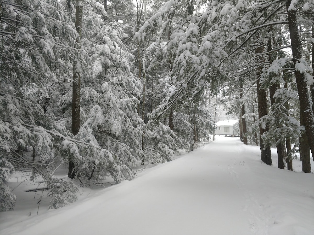 Serene rustic cabin in Colebrook, Ct in beautiful Litchfield County! Cozy King bed under skylight, queen downstairs, woodstove and all the comforts of home. Pure clean pond- swim, fish, canoe n kayak! Sits far from main roads on quiet back road. Can walk, run or bike to local trails or stay and walk the trail around the pond, have campfires outside in firepit! Cleaned by me, no crazy rules n and surrounded by nature! Private Great WIFI! Close to quaint ski resorts n dispensaries