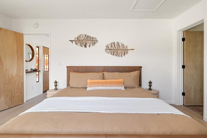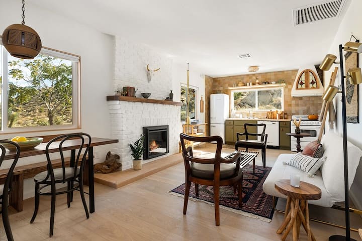 Vitajte v Petite Maison, elegantnej púštnej zrube zastrčenej medzi balvanmi s úžasným výhľadom, dizajnérskymi prvkami a luxusným pokojom. Toto štýlové útočisko s rozlohou 1 m ² sa nachádza na 5 súkromných akroch medzi národným parkom Joshua Tree a Pioneertown a je ideálne pre páry alebo sólo cestovateľov. Užite si manželskú posteľ, kúpeľnú sprchu, retro spotrebiče a nezabudnuteľné západy slnka pri ohnisku. Pokojný únik pár minút od najlepších reštaurácií, chodníkov a pozorovania hviezd.