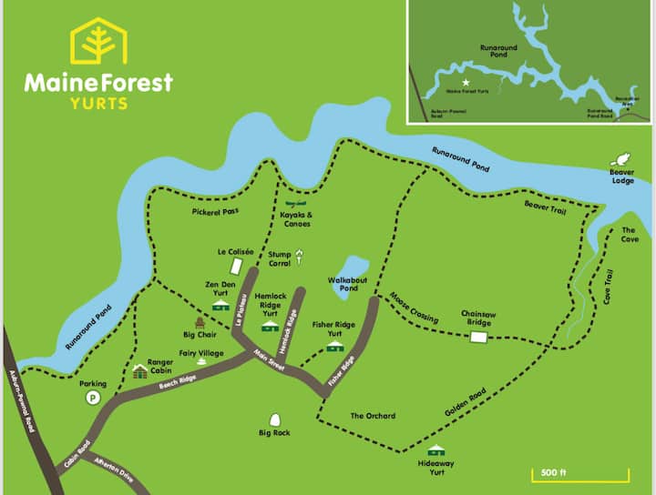 Maine Forest Yurts sa nachádza na 100 súkromných akroch na rybníku Runaround Pond v Durhame v Maine. Kemp sa nachádza v nedotknutom prostredí, ktoré je ideálne na víkendový výlet, dobrodružný jednodňový výlet alebo týždenný pobyt. Hostia si môžu vybrať, či sa ubytujú v jednej z našich luxusných jurt alebo si priniesť vlastný stan.