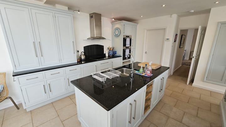Vstupné poschodie: Vstúpte do chodby s dverami do: hlavnej spálne s 5-palcovou manželskou posteľou a dverami na balkón, druhé dvere vedú do detskej spálne s 2 '6" jednolôžkom a prístelkou, detskou postieľkou a ďalšími dverami do mokrej miestnosti so bezbariérovou sprchou, WC a umývadlom na ruky a dverami späť do vstupnej haly. Obývacia izba s pohodlným posedením, sporákom na drevo, posuvnými dverami na veľký balkón a ďalšími dverami do útulného salónika. WC s umývadlom. Kuchynská jedáleň s veľkým centrálnym ostrovčekom, ohromujúce plne vybavené jednotky a spotrebiče, jedálenský stôl a stoličky, dvere do zadnej záhrady. Ďalšie dvere z kuchyne vedú do technického priestoru s práčkou a sušičkou. Schody z haly vedú do: