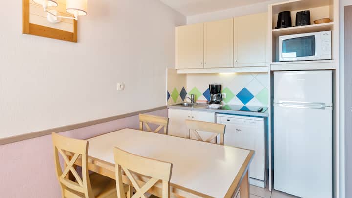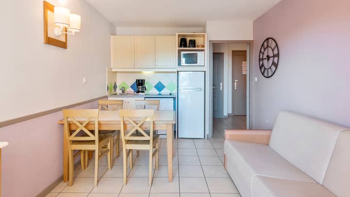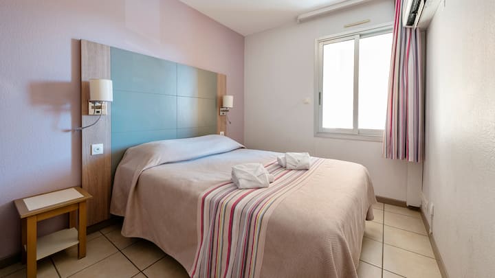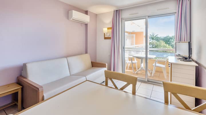 Ubytujete sa v klimatizovanom apartmáne zariadenom starostlivo. Tu sa budete cítiť ako doma. Môžete využiť balkón a vychutnať si jedlo pri pohľade na more. Obyvatelia budovy Lavandes budú mať tú česť, že sa budú môcť ponoriť do malého bazéna otvoreného od júna do septembra. Obyvatelia budovy Mimosas si od júna do septembra užijú bazén Mas de Tanit.
