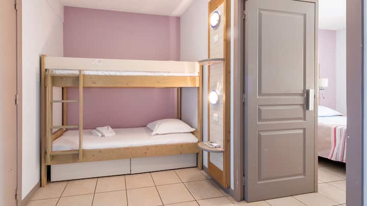 Obývacia izba s rozkladacou pohovkou pre dve osoby. Kuchyňa je vybavená. Spálňa má manželskú posteľ. Zrub s 2 poschodovými posteľami. Vaňa alebo sprcha a WC. Balkón alebo terasa. Upozornenie: niektoré apartmány sú vybavené poschodovými posteľami v spálni, a preto nemajú roh s kabínou.