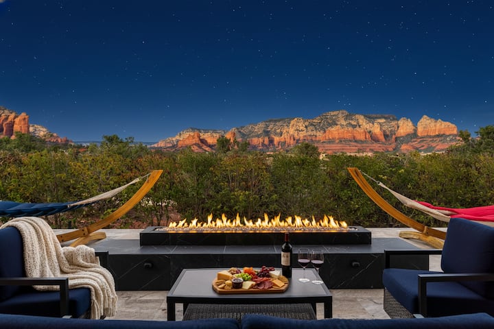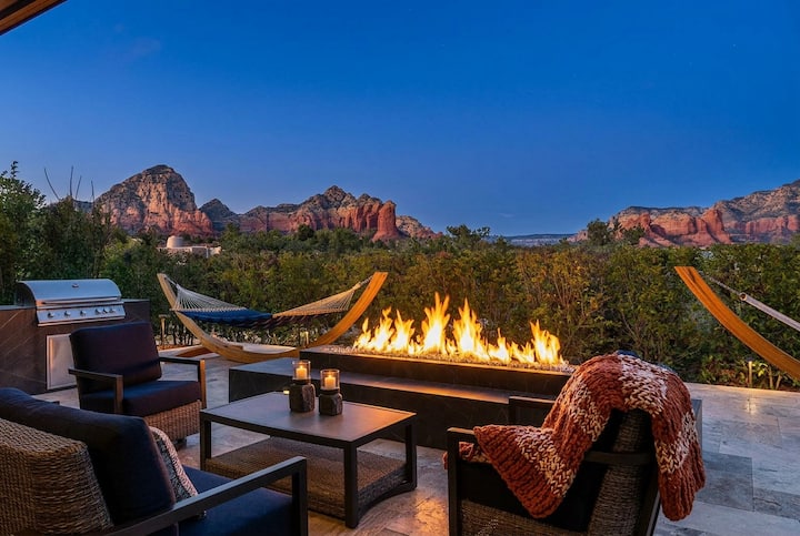V hlavnom dome vás očaria naše moderné panoramatické dvere, ktoré sa otvárajú a odhaľujú úchvatný výhľad na červené skaly Sedony, čím sa vonkajšie prostredie prenáša do interiéru. Otvorený pôdorys je skutočným vrcholom, ktorý ponúka priestrannú kuchyňu s obrovským ostrovom, jedálenským kútom a obývacou izbou s útulným kozubom. Vďaka týmto úžasným prvkom bude váš pobyt v našom ubytovaní určite nezabudnuteľný.