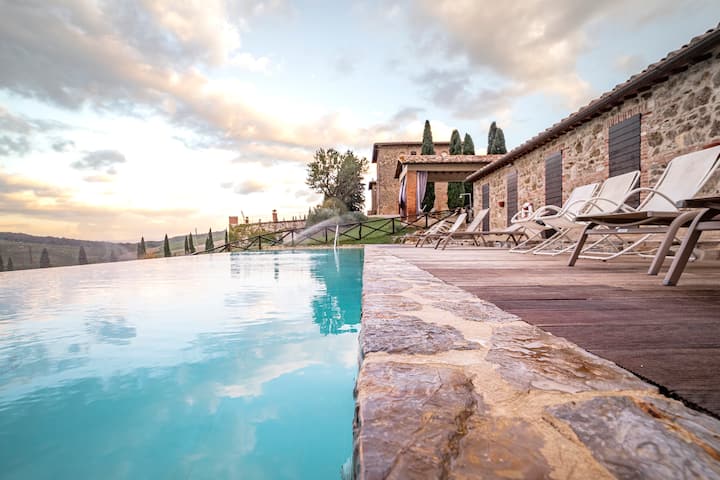Vitajte v Casale dello Sparviero ! Sme vinárstvo v srdci Chianti Classico len 20 minút jazdy od Sieny. Uvítame vás v našom statku vybavenom 6 apartmánmi, ktoré majú spoločný nekonečný bazén a panoramatickú terasu. Naše predajné miesto je otvorené každý deň, aby sme ponúkali ochutnávky vín našej výroby spolu s miestnymi špecialitami.