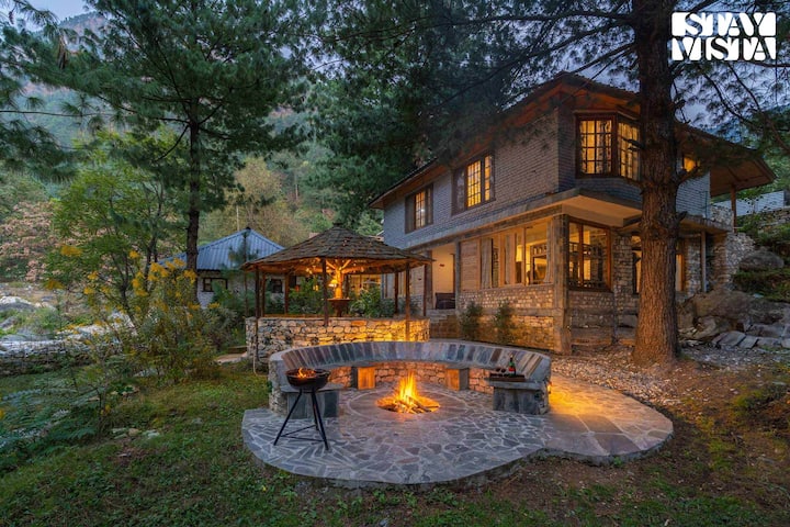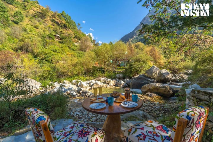 Breezy Banks sa nachádza uprostred úchvatnej krajiny Tirthan Valley a ponúka očarujúcu cestu od príchodu až po odchod. Keď prídete, obklopí vás pokojná atmosféra vďaka bujnej zeleni našich rozsiahlych priestorov. Prejdite sa po našich rozľahlých pozemkoch a objavte skrytý klenot, malý prírodný bazén, ktorý vás pozýva na osviežujúci kúpeľ. Sedenie pri rieke je ideálne na chvíle pokoja, kde môžete sledovať, ako sa voda jemne tiahne okolo. Vo večerných hodinách sa zhromaždite okolo ohniska alebo hľadajte úkryt v malebnom altánku, ktorý je osvetlený ako rozprávka.