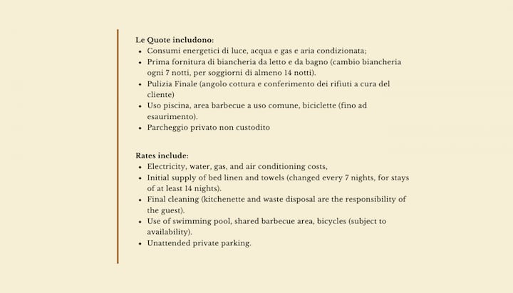 – spotreba elektriny, vody a plynu, klimatizácia, prvá dodávka posteľnej bielizne a uterákov (výmena bielizne každých 7 nocí, pri pobyte najmenej 14 nocí), záverečné upratovanie (okrem kuchynky a likvidácie odpadu); Wi-Fi (na čiastočné použitie), využitie bazéna, spoločný gril, parkovanie bez dozoru, používanie bicyklov (podľa dostupnosti, záloha za použitie)