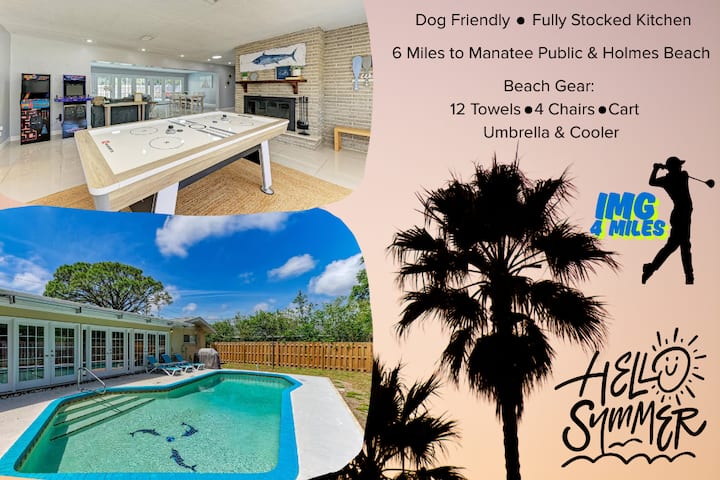 Uniknite do srdca West Bradentonu, pár míľ od 5 verejných pláží a menej ako 4 míle od Akadémie IMG. Turn-Key zariadený dom so slanou vodou, vysnívané útočisko na dovolenku alebo krátky výlet. Bright & airy open floor plan w/formal living rm w/a wood-burning fireplace, a family rm/dining rm combo w/ French door opening to the screened pool.Kitchen w/abundant storage & countertop space. Užite si zábavu s herňou - kávovar na stanicu Waffle, stôl na vzdušný hokej a arkádový kávovar a kávovar/čajový bar.
