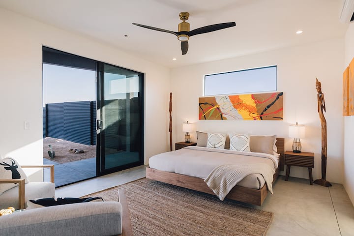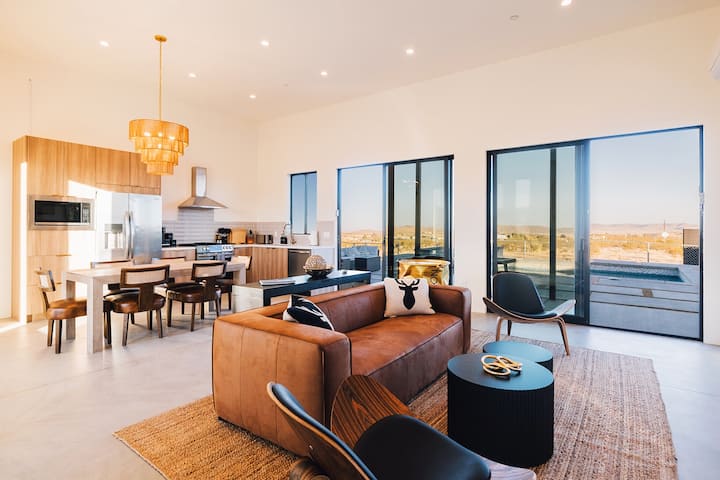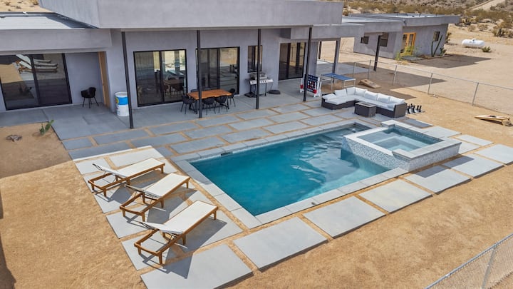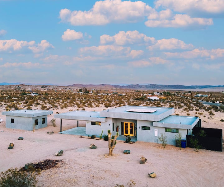 Golden Desert House: Jedinečný luxusný bazén s krásnym výhľadom na púšť Mojave a súkromím na 2 akroch. Vyhrievaný bazén, vírivka, ohnisko, gril a vonkajšie obývacie postele na pozorovanie hviezd alebo opaľovanie. Len 8 minút jazdy autom do centra mesta Joshua Tree a 16 minút jazdy od West Entrance JTNP. 15 minút do Yucca Valley s možnosťami stravovania a nakupovania potravín.
