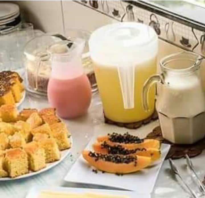 Čo je na raňajky: káva, mlieko, soľ, chlieb, koláč, džús, vajce