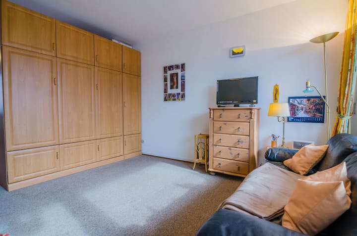 Tento útulný 1-izbový apartmán sa nachádza v Elisabethstr. 14/ dom „Eidum“ na 1. poschodí, hneď vedľa hotela „Utland“, len pár krokov od schodiska, pešej zóny a mnohých nákupných príležitostí. Apartmán pozostáva z obývacej izby/spálne s manželskou posteľou (samostatné matrace) , útulnej pohovky a jedálenského priestoru. Nachádza sa tu aj samostatný kl. Kuchyňa/sporák s 2 horákmi/ mikrovlnná rúra. Sprchovací kút má vonkajšie okno. Slnečný balkón vedie na južnú stranu domu. Tu zostanete potichu, ale veľmi centrálne vo Westerlande. Apartmán je vybavený pre 2 osoby. V dome je možnosť využitia garážového priestoru. Majte na pamäti : Pozorujte výšku zdviháka a vchodu do brány. Upozorňujeme, že v okolí prebiehajú stavebné práce, na ktoré nemáme žiadny vplyv.