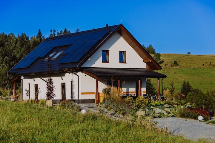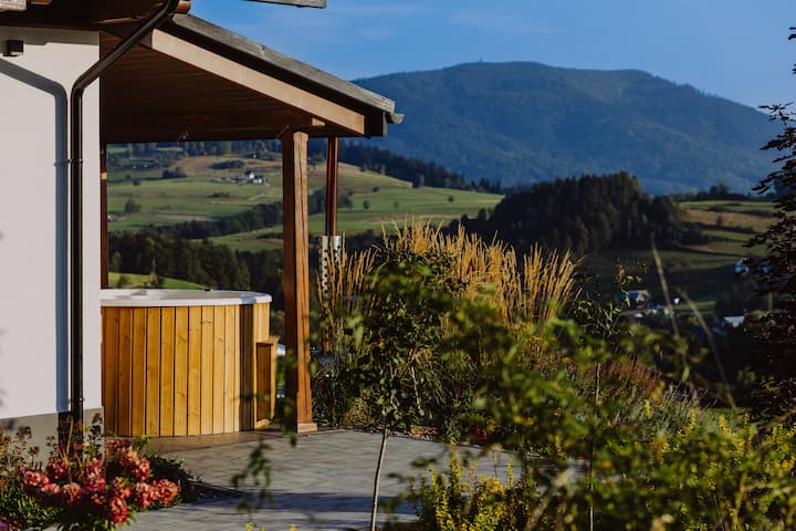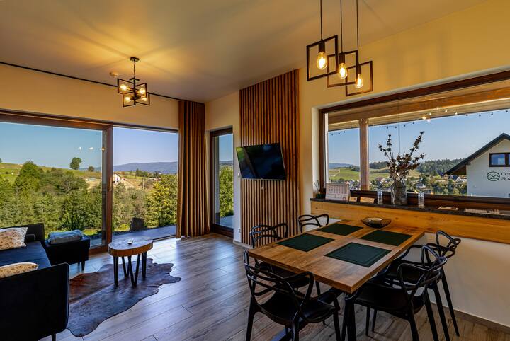 Dáme vám dva moderné apartmány, kde má každý rozlohu 74 m2. Nazvali sme ho apartmán S VÝHĽADOM na Maciejowa a apartmán Luboń VIEW. Ako ukazujú samotné mená, výhľady z týchto apartmánov smerujú do Gorce a Island Beskids. Každý apartmán má dve samostatné spálne s veľkými posteľami a dve kúpeľne. Na prízemí sa nachádza presklená s veľkými okenicami, obývacia izba s kuchynským kútom. Každý apartmán má priestrannú terasu so zelenou záhradou. Toto je moment, kedy môžete chodiť bosí po tráve. Máme prakticky všetko, čo potrebujete na každodenné fungovanie. Máme dokonca aj chladničku, umývačku riadu, práčku, indukčnú varnú dosku a hrnce na varenie. Nájdete tu aj žehličku, žehliacu dosku, WI-FI televízory a káblovú televíziu s Netflixom. Vieme, že nie každý sem príde, aby sa prechádzal po horách, takže... máme pre vás KÚPELE. V samostatnej budove budete môcť nielen využívať relaxačné centrum, ale aj výhľad na rozprávky. Na poschodí sa nachádza vírivka pre 6 osôb so suchou saunou, na hornom poschodí je potrebné použiť promóciu, kde sa suvenír Rabczska robí zo zdravotných divov. Okrem toho, v soľnej miestnosti, kde budete môcť používať terapiu soľou Kłodowska, ktorá v kombinácii so slaninou poskytuje veľmi vysoké liečivé vlastnosti. Z lindenového stromu sme pripravili saunu a na promóciu sme použili brezové vetvy. Môžete s nami stráviť večery, a ak sa nudíte, zapálite táborák a smažíte si klobásu na samostatne vyhradenom priestore.