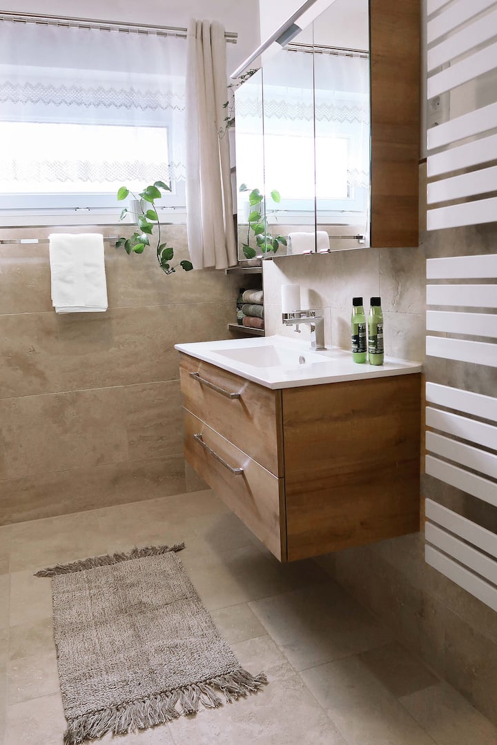 Steny kúpeľne a podlaha v kúpeľni, chodbe a kuchyni sú vybavené novo položeným travertínom. Tento prírodný kameň so stredomorskou atmosférou vytvára pocit dovolenky hneď, ako vstúpite dovnútra. Vďaka podlahovému kúreniu je tu úžasne teplo a pozýva vás chodiť naboso.