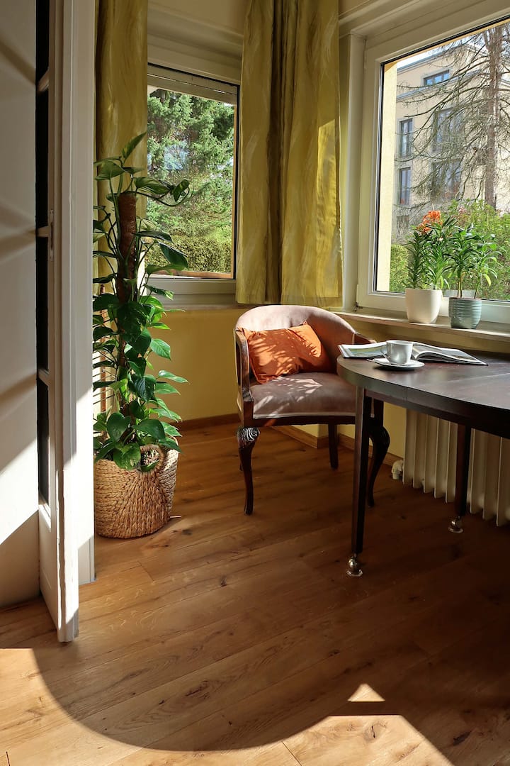 Blízko centra a napriek tomu v tichej lokalite: Tešíme sa, že Vás privítame v tejto kombinácii krásneho dovolenkového apartmánu s rozlohou 104 m² na prízemí a útulného apartmánu s rozlohou 20 m² na najvyššom poschodí. Ideálne pre maximálne 8 osôb! Oba apartmány sa nachádzajú v tom istom dome: v očarujúcej, tichej starej vile s veľkou záhradou hneď vedľa TU Drážďany, len pár kilometrov od centra mesta a historického starého mesta. Psy sú vítané po predchádzajúcej dohode.