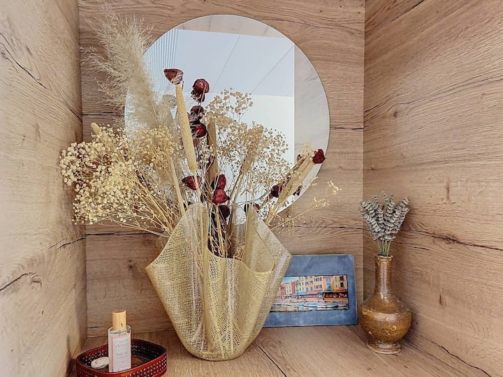 Nachádza sa na 1. poschodí krásnej novej rezidencie s výťahom. Budova je veľmi kvalitná. Vstup sa otvára priamo do veľkej obývacej izby s plne vybavenou kuchyňou, ktorá sa otvára do jedálne a obývacej izby, v ktorej sa nachádza rozkladacia pohovka na oddych (ktorá sa dá v prípade potreby premeniť na lôžko pre 5 osôb). Priestor rozširuje terasa s rozlohou 15 m². Pripravili sme stôl a stoličky, aby ste si mohli vychutnať chutný aperitív a rodinné jedlá.