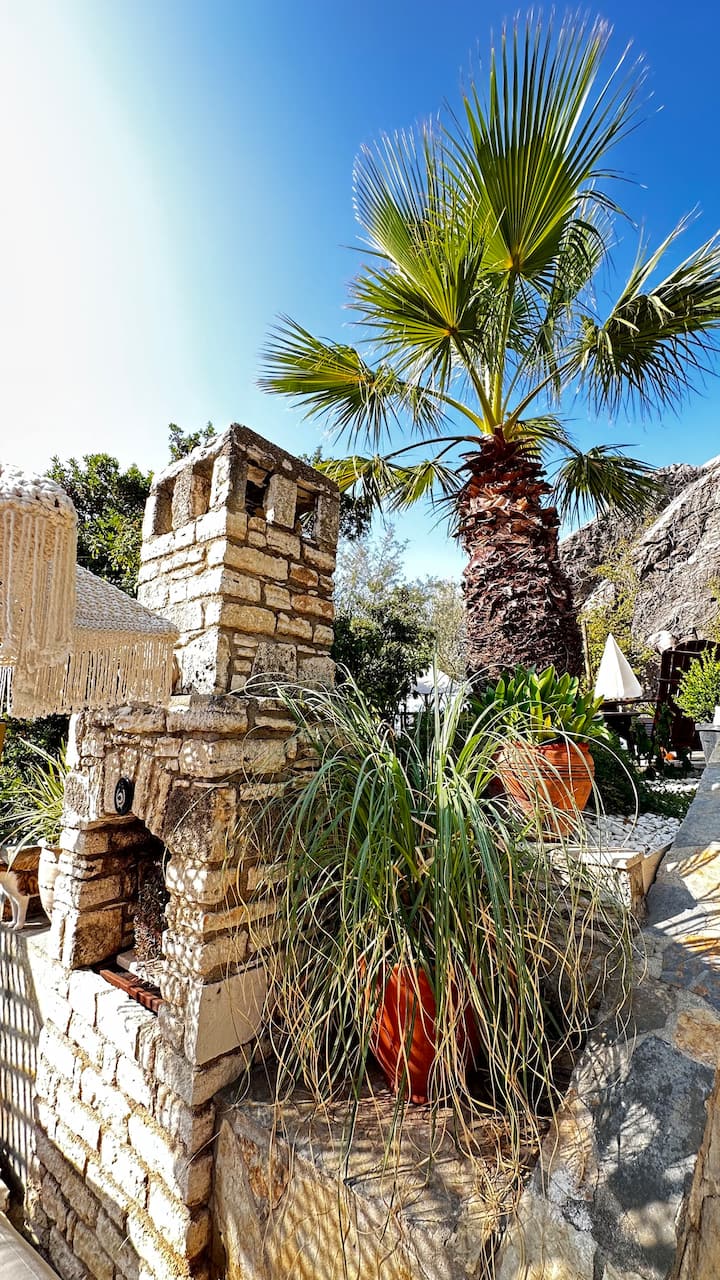 Večer špeciálne osvetlenie premení skalnú formáciu na romantické a mystické pozadie. Užite si jemný morský vánok na terase a sledujte, ako sa svetlá Bodrumu trblietajú a mesačné svetlo sa odráža na mori.