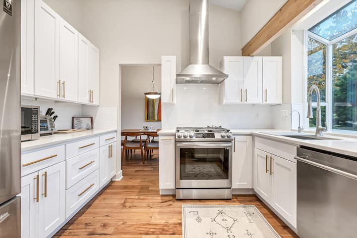 Kuchyňa: Veľká, aktualizovaná kuchyňa je dobre zásobená na každodenné varenie a zábavu. Veľké pulty sú vynikajúce na prípravu jedál. K dispozícii je dostatok miesta na uloženie jedla a akýchkoľvek ďalších kuchynských potrieb, ktoré si môžete priniesť so sebou na pobyt. Medzi spotrebiče patrí plynový sporák, veľká chladnička, umývačka riadu, kávovar, rýchlovarná kanvica, mixér, mikrovlnná rúra a hriankovač. Snažíme sa mať po ruke niektoré základné suroviny vrátane korenín, oleja na varenie, cukru a múky (množstvo a presné položky sa môžu líšiť). Okná s výhľadom na zadný dvor.