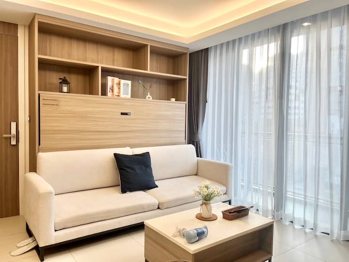 1 manželská posteľ a 1 jednolôžko boli dobre pripravené v tomto apartmáne a môže ubytovať až 3 osoby. Okrem toho si môžete vychutnávať bazén a posilňovňu vo vnútri budovy. Pre tých, ktorí radi varia, máme pekne otvorenú kuchyňu a vybavenú základnými spotrebičmi, ako je mikrovlnná rúra, chladnička, riad pre 3 osoby a takmer všetko, čo budete potrebovať na varenie. Navyše, bezplatné Wifi, uteráky, malé uteráky, žehlička, sušič vlasov, sprchový gél, šampón, kondicionér, práčovňa, ryža varič, rýchlovarná kanvica, papuče, stojan na oblečenie sú tiež dobre pripravené pre váš pobyt.