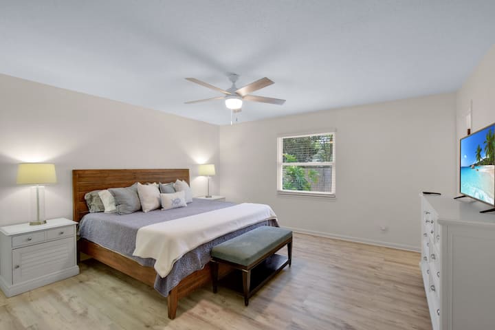 Gone Coastal má kapacitu 8 osôb, má 3 skutočné spálne, 2 kúpeľne a oplotený dvor taký veľký, že váš pes sa môže vrátiť osvietený. Je to ten druh plážového prenájmu, kde sa rýchlo rozprestriete – vyzujete si topánky na príjazdovej ceste, zabudnete, kam ste si dali telefón, a o hodinu neskôr skončíte na verande, kde sa rozprávate o včerajšom strašidelnom príbehu.