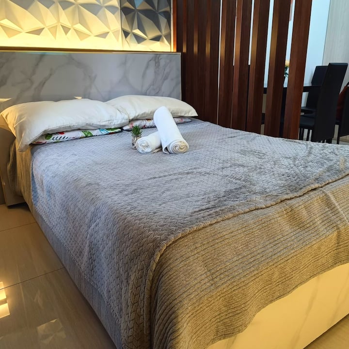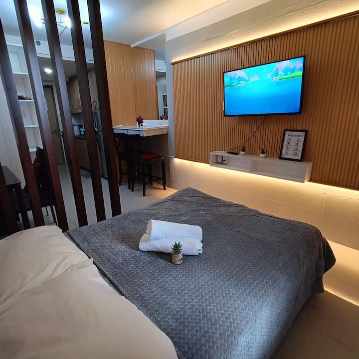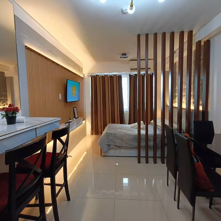 Ubytujte sa v tomto svetlom, modernom štúdiu ideálnom pre 2 – 4 hostí, ktorý ponúka súkromný balkón a čisté, štýlové interiéry. Len 5 minút od nákupného centra Mall of Asia a 15 minút od letiska NAIA, s ľahkým prístupom k verejnej doprave, reštauráciám a potravinám. Vychutnajte si rýchle Wi-Fi, útulný kuchynský kút a vybavenie budovy, ako je bazén a posilňovňa. Či už ste tu na nákupy, tranzit alebo voľný čas, tento priestor ponúka pohodlie a komfort v srdci Manily.