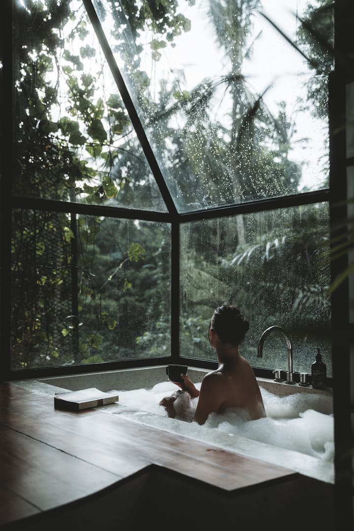 Ubytujte sa v blízkosti centra Ubudu a vychutnajte si našu jedinečnú vilu posadenú na okraji bujnej tropickej rokliny so skleneným bazénom, terasou na jogu v korunách stromov a skrytým barom.