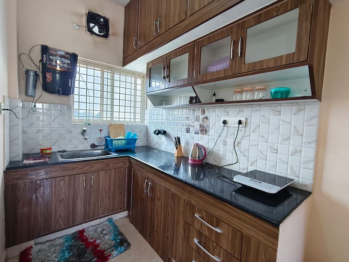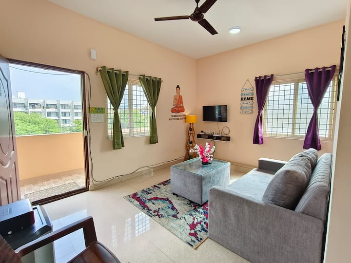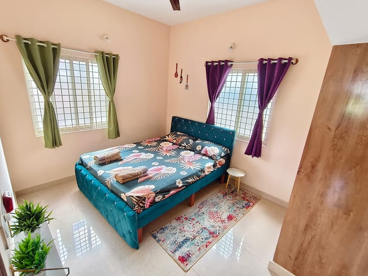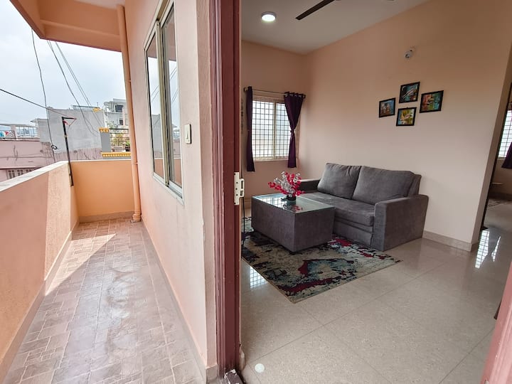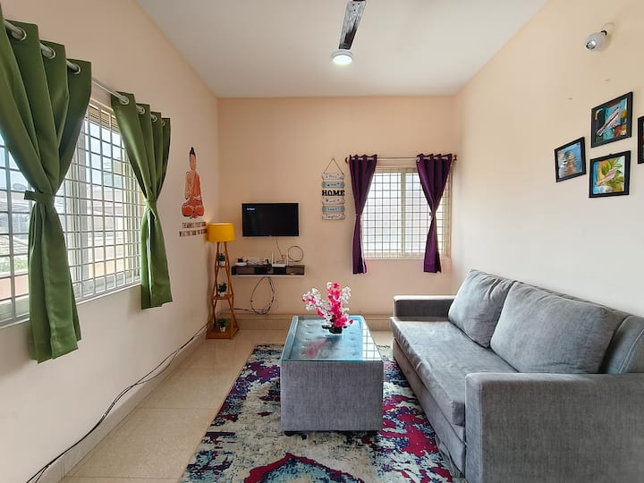 Vaša rodina bude blízko všetkého, keď sa ubytujete na tomto centrálne umiestnenom mieste. Toto je 1BHK Plne zariadený apartmán na Old Madras Road ,hneď za hotelom KR Inn a apartmánom MAqua. Manželské postele veľkosti King v spálni, rozkladacia pohovka v matraci v chodbe znamená, že je dostatok na ubytovanie skupín až 4 ľudí, jedna spoločná kúpeľňa. LED inteligentná televízia, pohovka, čistá posteľná bielizeň, plnohodnotná kuchyňa, Power Back-up pre ventilátory a svetlá, všetko sme pokryli.