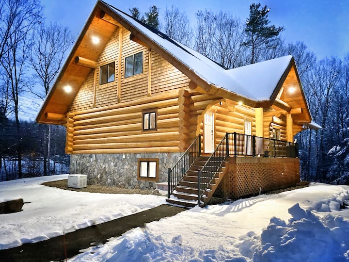 Uniknite do našej luxusnej zrubovej chaty v zasneženej krajine zázrakov v New Hampshire. Naša zrub je ideálna na útulný pobyt alebo zimné dobrodružstvo a ponúka: