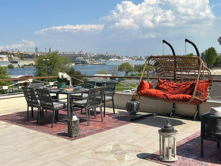 Rozľahlá terasa s rozlohou 100 metrov štvorcových, ktorá sa nachádza na treťom poschodí a je spoločná s apartmánom nižšie, sa môže pochváliť úchvatným výhľadom na Istanbul a more a ponúka skutočne ikonickú panorámu. Ponúka tri veľké jedálenské stoly až pre 20 osôb, gril, vďaka čomu je ideálny na zábavu a útulnú zimnú KUPOLU s Playstation 5, ktorá je ideálna na vychutnanie si výhľadu a pohodlný oddych vo všetkých ročných obdobiach.