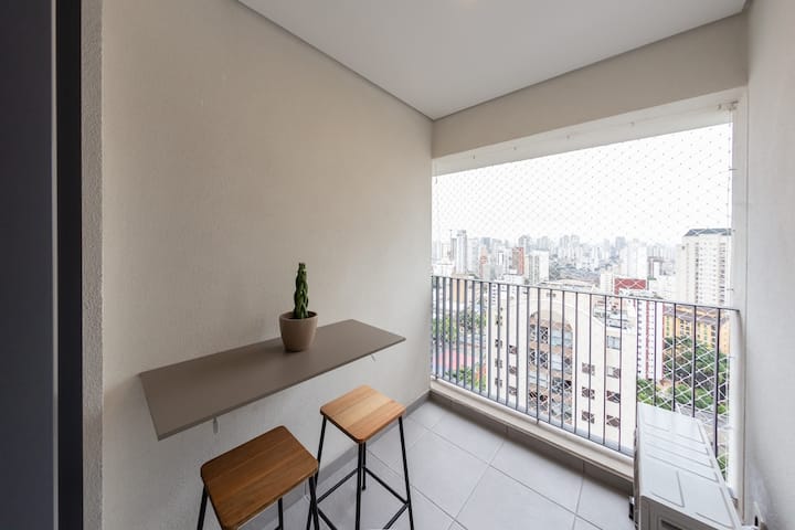 Predstavte si, že začnete svoj deň na očarujúcom balkóne a vychutnáte si panoramatický výhľad na mesto a zároveň si vychutnáte čerstvú kávu. Vstavaný stôl s dvoma lavičkami je ideálnym miestom na oddych a inšpiráciu mestskou energiou alebo na chutné jedlo.