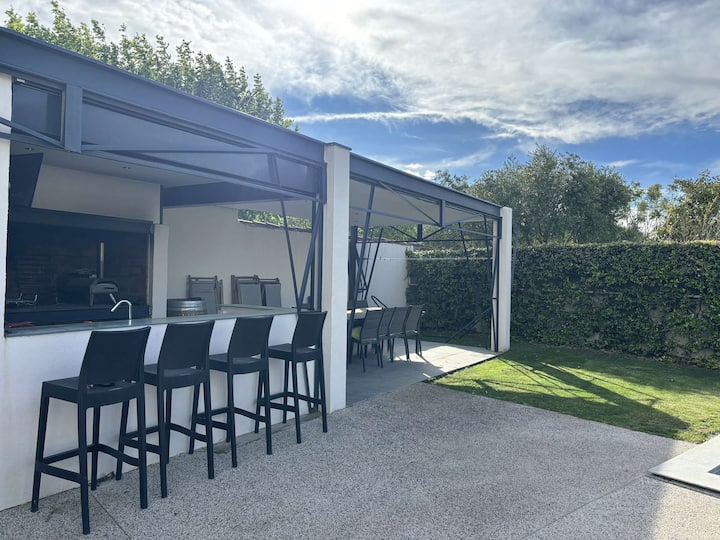 Dom pri bazéne pozostáva z časti grilu a plancha, chladiacej banky, umývadla a stola, všetko chránené a viditeľné zo záhrady a bazéna.