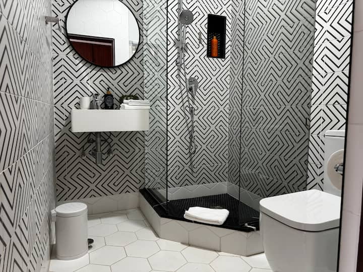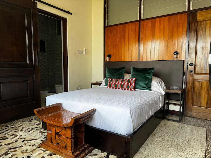 Vitajte v našej štýlovej butikovej vilovej izbe, ktorá ponúka dokonalú kombináciu pohodlia a elegancie. Táto izba má plyšovú manželskú posteľ zdobenú živými vankúšmi a drevenými prvkami. Priestor je doplnený moderným osvetlením, útulným posedením a dostatočným úložným priestorom. Vlastná kúpeľňa sa môže pochváliť elegantným dizajnom so sprchovacím kútom a elegantnými geometrickými dlaždicami. Vychutnajte si bezplatné raňajky pripravené šéfkuchárom, každodenné upratovanie a bezpečné, uzavreté prostredie pre príjemný pobyt.