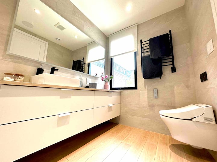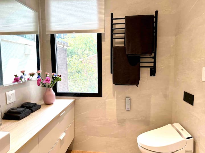 V celom objekte nájdete vyhrievané podlahy, vysoké stropy, cédrovú vírivku na terase, moderné toalety a veľké okná s výhľadom na park.