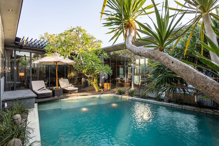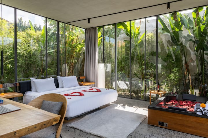 Doprajte si našu jedinečnú vilu v priemyselnom štýle s 2 spálňami, ktorá bola vytvorená s ohľadom na moderný luxus, pohodlie a komfort. Každý centimeter je navrhnutý podľa najvyšších štandardov s najlepšími luxusnými značkami. Užite si osobnú saunu, ktorá je k dispozícii od 8.00 do 17.00 hod., a vírivku v spálni, ktorá váš pobyt dotiahne k dokonalosti. Ponorte sa do súkromného bazéna, vychutnajte si Smart TV, plne vybavenú kuchyňu a malebnú bujnú zeleň. Nachádza sa v pulzujúcej štvrti Seminyak a je ideálny na oddych a dopriať si moderné vybavenie.