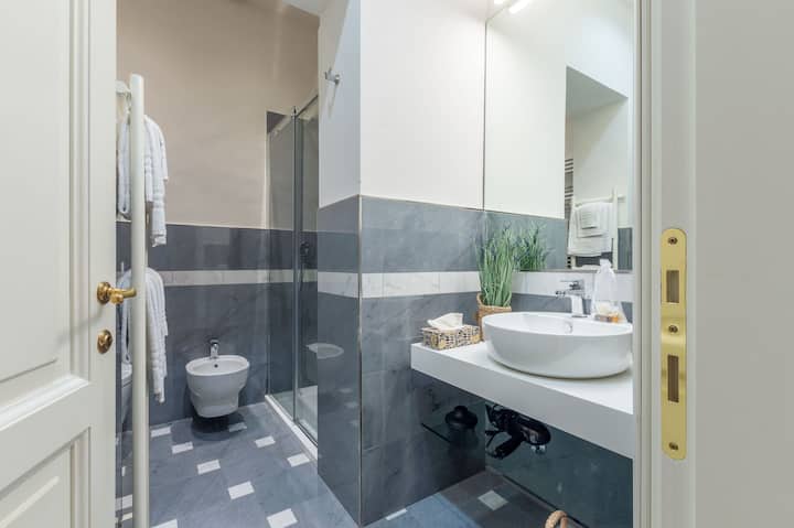 Kúpeľňa je zariadená zo sivého a bieleho mramoru, čo dáva rafinovaný tón. Je vybavený toaletou, bidetom, veľkou sprchou, pohodlným zrkadlom nad umývadlom a úložným priestorom na práčku, metlami, vysávačom...
