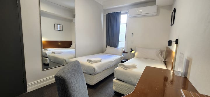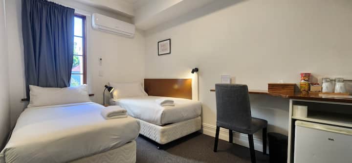 NewtownCozyStays - spálňa s vlastnou kúpeľňou s oddelenými posteľami