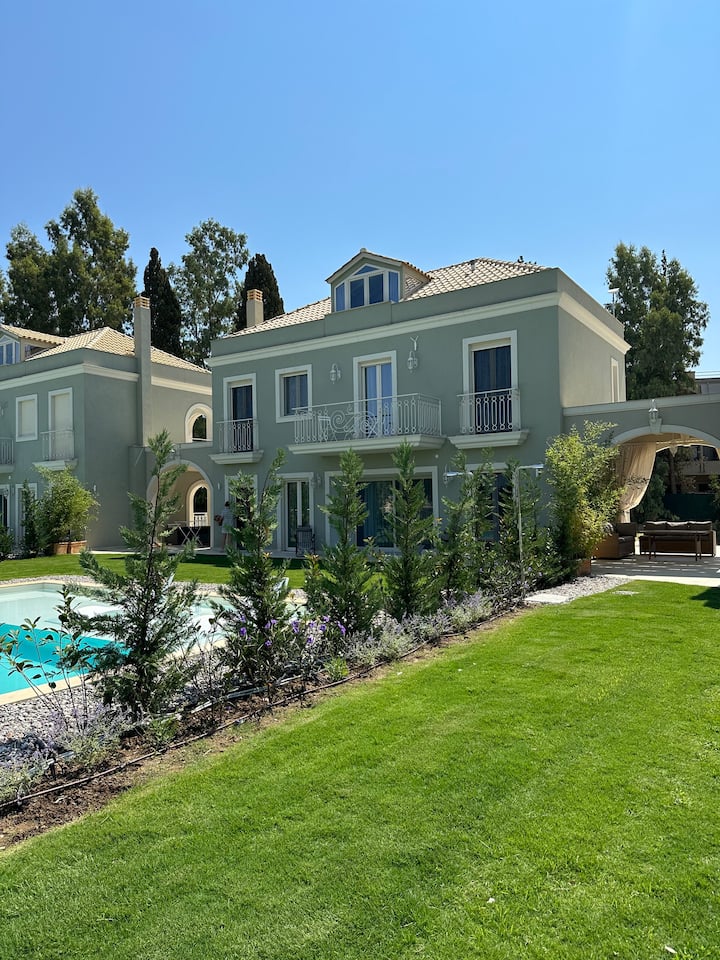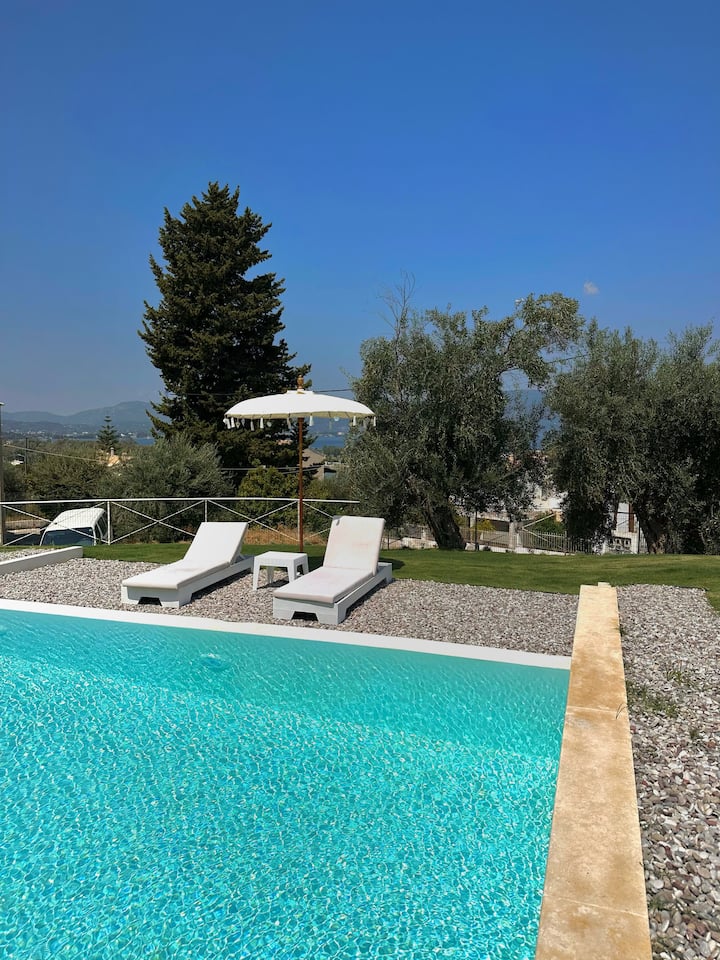 Vila je oázou pokoja a krásy s nádherným výhľadom na Iónske more a mesto Korfu .