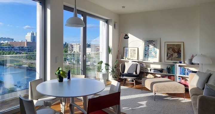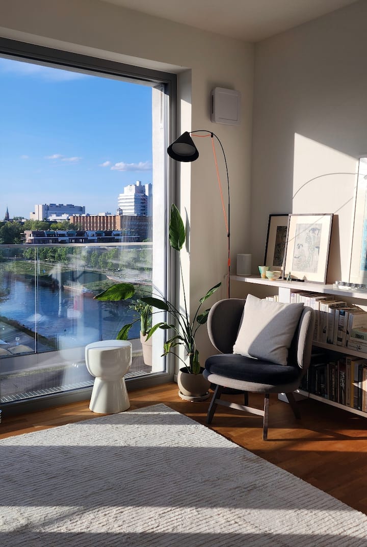 Svetlý priestor s výhľadom na strechu, vodu a parkovanie
