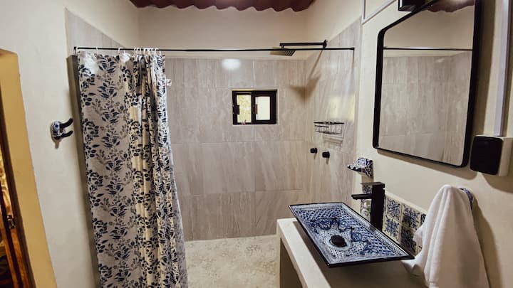 Plne vybavená kúpeľňa s rustikálnymi detailmi a elegantným umývadlom talavera zaručuje pohodlie v jedinečnom priestore.