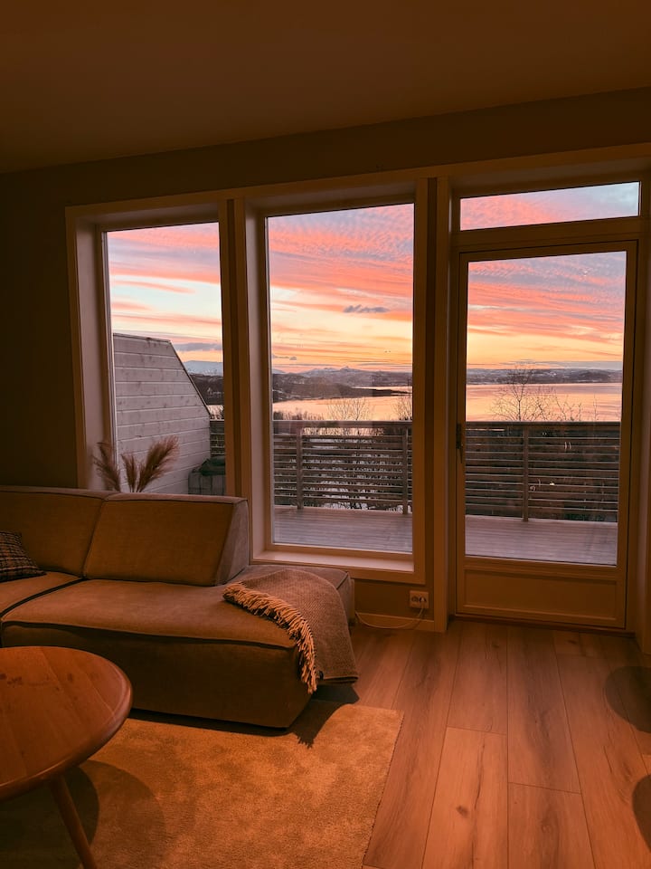 Moderný dom na ostrove Senja so západom slnka a prírodou
