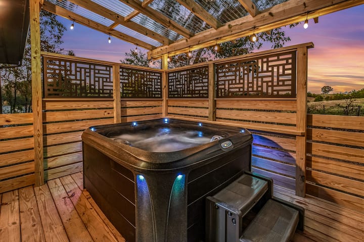 Vonkajší priestor zalesneného úkrytu sa nachádza v pokojnom prostredí a štrková príjazdová cesta sa vinie cez prírodný baldachýn stromov a ponúka pokojný a odľahlý pocit. Predná terasa ponúka dokonalú kombináciu prístrešku a otvorenosti s čiastočne krytým priestorom spolu s nekrytým priestorom. Nájdete tu pohodlný propánový gril na vonkajšie varenie, príjemný piknikový stôl na stolovanie pod šírym nebom a útulný priestor na posedenie s prúteným nábytkom na oddych. Keď sa presuniete na zadnú terasu, objavíte súkromné útočisko s krytým priestorom s luxusnou vírivkou, ktorá poskytuje pokojné miesto na oddych a vychutnanie si prírodného prostredia v pohodlí. Hneď z terasy objavíte ohnisko osvetlené svetlami, ktoré je ideálne na pečenie marshmallow a skvelý čas.