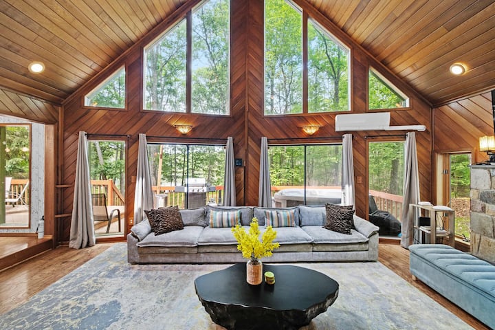 Doprajte si rodinný výlet v Chalet Eclat – útulnej chate pri jazere v Poconos. Toto útočisko s 5 spálňami kombinuje pohodlie a zábavu s pokojnou prírodou. Vyhrievajte sa v upokojujúcej vírivke s výhľadom na pobrežie, omladzujte sa v saune alebo sa zapojte do temperamentných súbojov v herni. Váš pobyt s exkluzívnym prístupom k vybaveniu rezortu Penn Estates sľubuje relaxáciu aj vzrušenie. Ponorte sa do života pri jazere s pohodlím ako v kúpeľoch a zažite nezabudnuteľný pobyt. Hostí Wander Home.