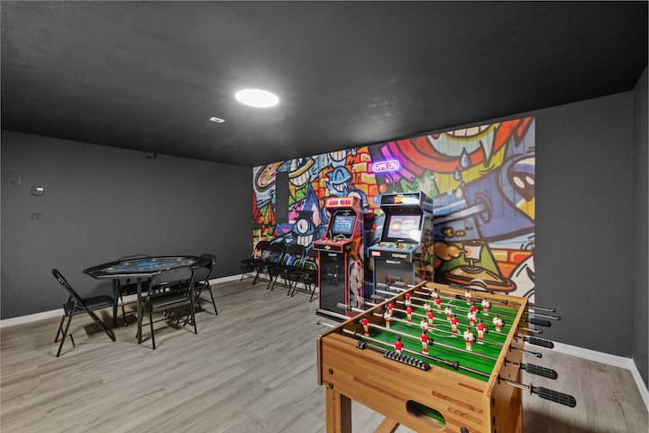 ● Herňa s pokerovým stolom, stolným futbalom a arkádovými hrami (NBA Jam a X-Men)