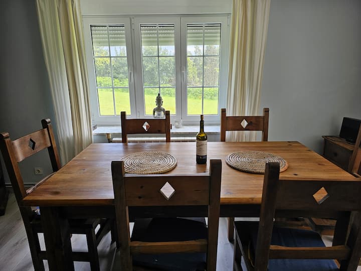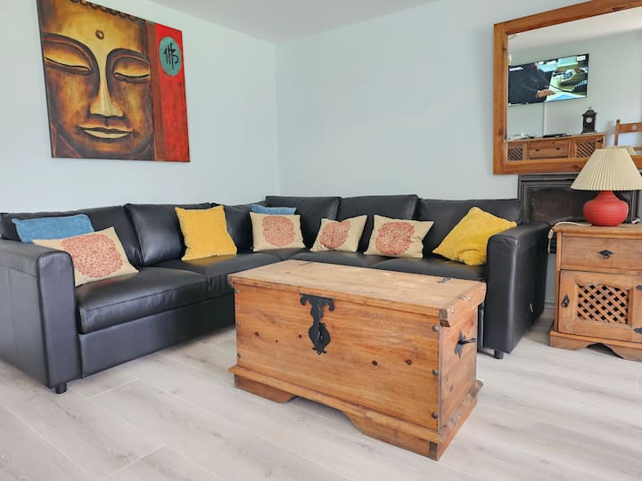 Obývacia izba má nový nábytok pre vaše pohodlie spolu s krásnym ručne vyrobeným konferenčným stolíkom z gaštanového dreva (starajte sa oň!) a veľkým jedálenským stolom z masívu. K dispozícii je inteligentný televízor, takže sa môžete prihlásiť do svojho účtu Netflix, spolu s DVD prehrávačom a asi 300 DVD.