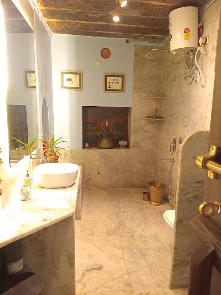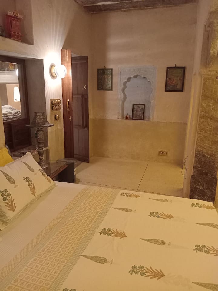 Historický Haveli, kde budete ubytovaní, má krásne zariadenú spálňu s pripojenou vlastnou kúpeľňou, plne vybavenú kuchyňu (chladnička, mikrovlnná rúra, indukčný sporák, rýchlovarná kanvica, RO), bezplatné Wi-Fi, obývaciu izbu s pohovkou a krásnu terasu s výhľadom na pevnosť.