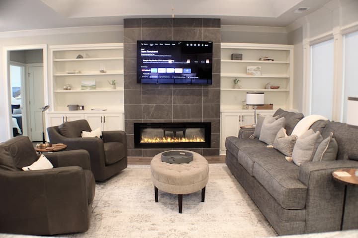 Toto pokojné a elegantné bývanie ponúka množstvo pohodlia a relaxácie. Krásne detaily a dostatok použiteľného vonkajšieho priestoru robia z tohto bývania ideálny začiatok vašej dovolenky. Priestory na čítanie/konverzáciu, pohodlný priestor na písací stôl, luxusné vybavenie obývacej izby, elektrický krb a televízor s veľkou obrazovkou vám umožňujú relaxovať vo veľkom štýle. Dobre navrhnutá kuchyňa je srdcom domova. V spojení s vonkajším propánovým grilom a otvoreným koncepčným prostredím je ideálny na vychutnanie si domácich jedál. Ak potrebujete chvíľku pokojnej meditácie, vyjdite na priestrannú zadnú verandu, oddýchnite si v pohodlnej stoličke, sadnite si na slnko alebo sa prejdite po krásnej lesnej ceste, ktorá sa nachádza priamo za domom. Užite si tri nádherné spálne, z ktorých každá má manželskú posteľ a televízor s plochou obrazovkou. Priestranná hlavná vaňa zahŕňa prechádzku v sprche, toaletné potreby a veľký priestor v skrini. Dve spálne majú spoločnú druhú kúpeľňu s toaletou. Hostitelia ponúkajú niekoľko hier a kníh pre vaše potešenie, ktoré sa nachádzajú v skrinkách v blízkosti krbu. Príjazdová cesta je spočiatku strmá, ale na vrchole je rovná. Garážové miesto je zahrnuté v používaní bývania.