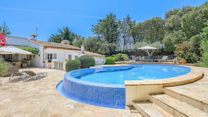 Obývacia izba a jedáleň sú otvorené, pohodlné a štýlovo zariadené. Užite si luxusné biele pohovky, oheň na drevo a vynikajúci výhľad do záhrady. Elegantná kuchyňa má všetky možné spotrebiče a vedie na krytú terasu a gril. Botanici si zamilujú starú záhradu plnú kvetov a nádherný mäkký trávnik (nie je ľahké ho na Malorke dosiahnuť!) Záhrada je v prednej časti domu a zahŕňa pokojné posedenie, ideálne na rannú kávu. Veľmi príjemný, iskrivý modrý bazén v tvare obličky sa nachádza v zadnej časti domu spolu s nádherným vonkajším jedálenským priestorom, výberom elektrického alebo dreveného grilu a ležadlami. Posaďte sa, vychutnajte si slnečné lúče a relaxujte pri speve vtákov.