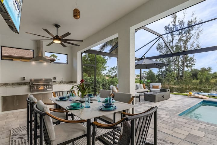 Život vonku – vstúpte do stelesnenia vonkajšieho bývania na našej rozsiahlej verande, kde sa pohodlie stretáva so štýlom! Tento príjemný priestor ponúka luxusné posedenie pri útulnom krbovom stole, ktorý je ideálny na intímne stretnutia pod hviezdami. S množstvom ležadiel navrhnutých tak, aby ste sa mohli vyhrievať na nádhernom slnku na Floride, nájdete ideálne miesto na nasávanie tepla a oddych. Pripravte sa na bezproblémovú zábavu so vstavaným grilom a televízorom, vďaka čomu je stolovanie pod šírym nebom príjemným zážitkom. Či už ide o „happy hour“ s priateľmi, alebo o pokojné jedlo na čerstvom vzduchu, naša vonkajšia oáza poskytuje dostatok priestoru na oddych a vychutnanie si krásneho počasia.