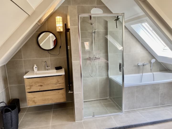 Druhá kúpeľňa ponúka luxusný zážitok s masážnou sprchou a vaňou, kde sa môžete pozerať na hviezdy.