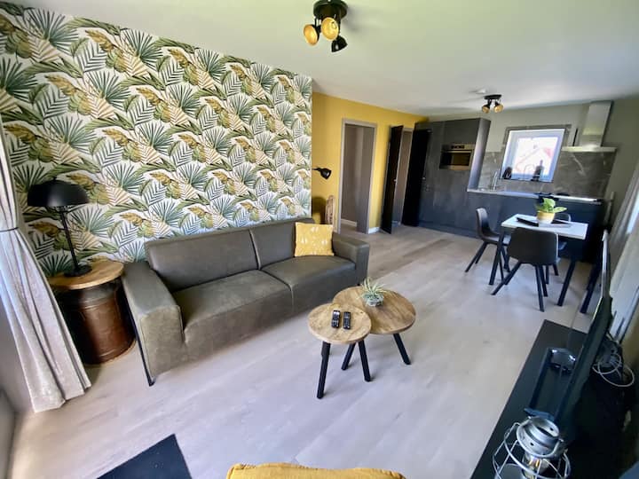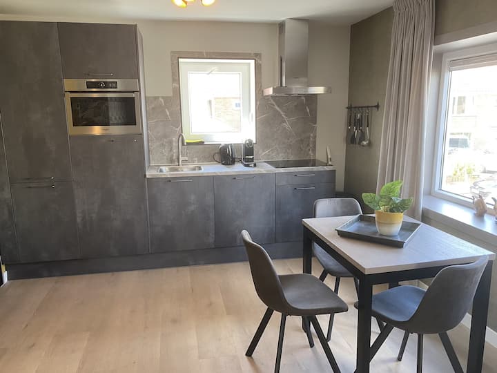 **Štýlová obývacia izba a kompletne vybavená kuchyňa** Pri vstupe prednými dverami vstúpite do vkusne zariadenej obývacej izby s kvalitnou pohovkou a kreslom, ktorá je ideálna na oddych. Okrem holandčiny má televízor aj nemecké kanály. Kuchyňa je plne vybavená indukčnou varnou doskou, umývačkou riadu, chladničkou s mraziacim boxom a kombinovanou rúrou. S príbormi, riadom a všetkým potrebným kuchynským riadom ste plne vybavení na lahodnú domácu večeru. Z jedálne máte výhľad na duny a bulvár.